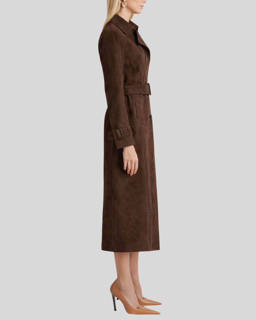 Whether worn over office attire or styled with dresses and heels for evening wear, this suede double breasted coat offers effortless refinement and enduring style for modern wardrobes.