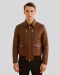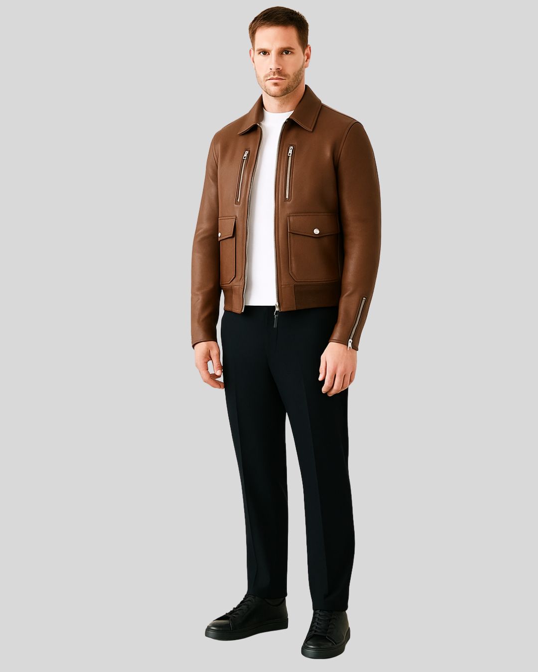 The Brown Leather Utility Bomber Jacket blends minimalist structure with vintage-inspired utility for the modern man. Crafted in rich tan lambskin, it features sharp vertical zip chest pockets and dual flap waist pockets for both style and function.