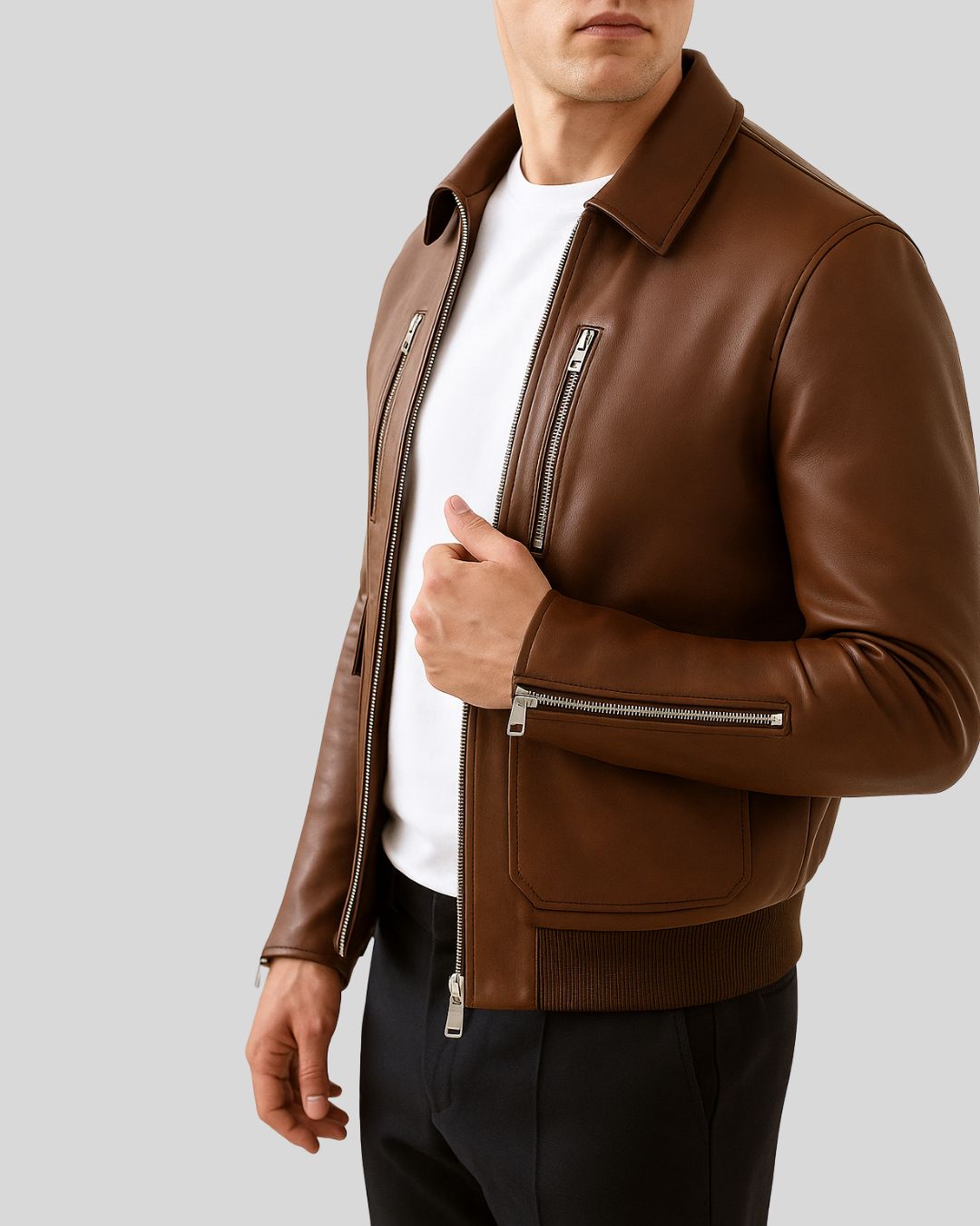 Sleek yet substantial, this brown leather jacket is structured with a ribbed hem and cuffs, a polished collar, and a dual-direction zip closure—ideal for city dwellers who value smart design and timeless masculinity.